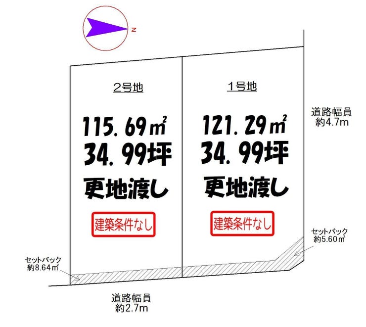 | 備考 | ★建築条件なし★解体更地渡し★有効宅地面積土地34坪あり ★2WAYアクセス★買い物便利な立地です ※建築時セットバック要(約5.60㎡) ※上下水道・ガス引込なし |