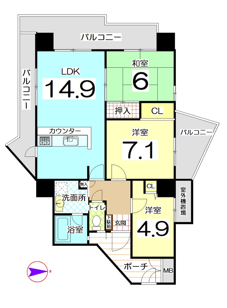 3面バルコニー
